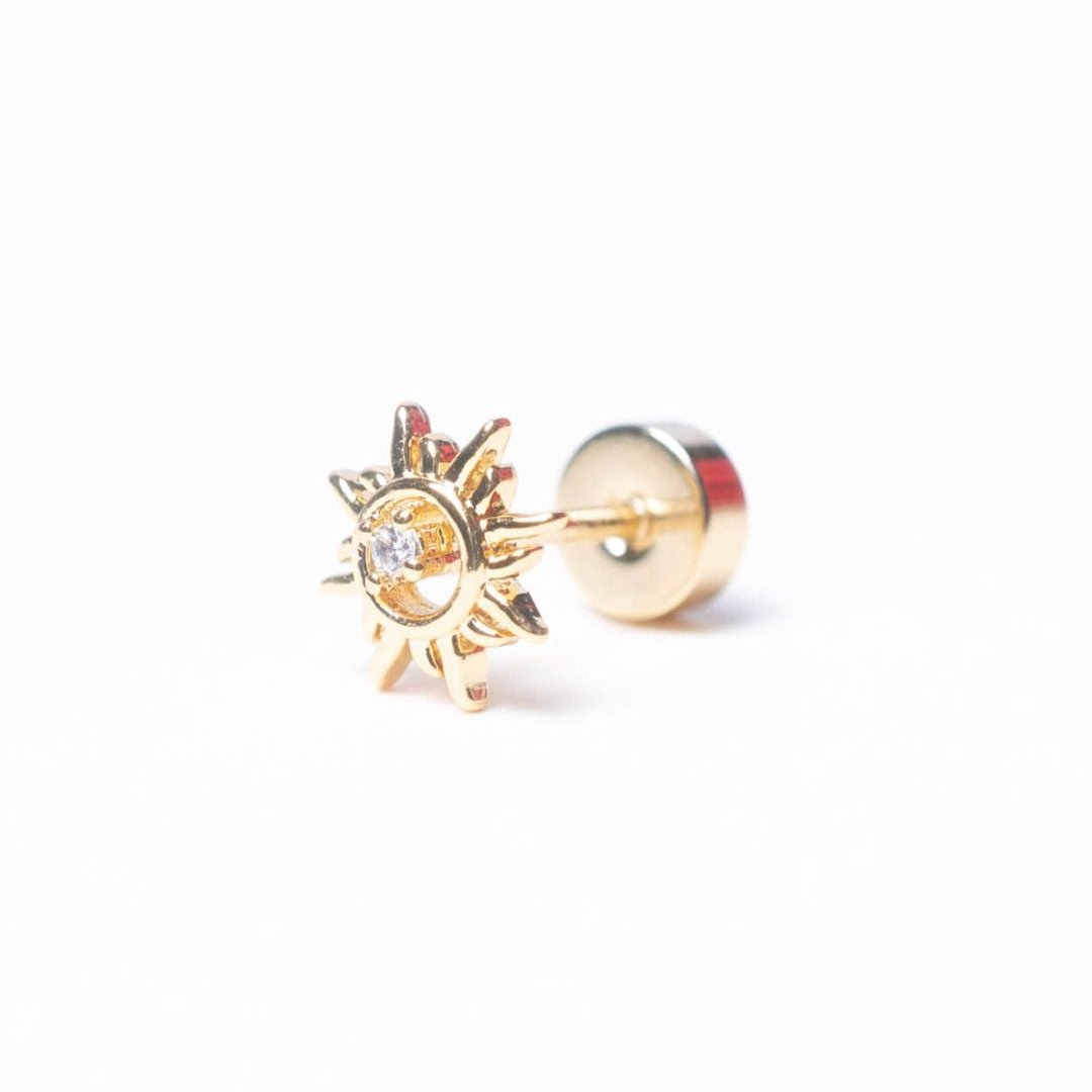 Este piercing en forma de sol, chapado en oro, irradia un estilo radiante con su diseño brillante y detallado. Hecho de acero inoxidable, aporta un toque luminoso y sofisticado a tu look.